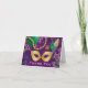 Festive any age mardi gras mask birthday party thank you cards with a gold mask with faux glitter look green, gold and purple feathers and green ties, balloons, beads, bokeh and ornate patterns in the background. Whether you're celebrating in the french quarters of New Orleans or you are in the Fat Tuesday spirit, you'll Laissez Bon Temps Rouler with these fun masquerade themed thank you notes in the tradition mardi gras colors. Artwork © Chrissy H. Studios, LLC. All rights reserved.