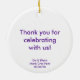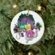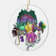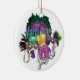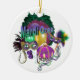 Round ceramic ornament with a festive image of a feathered headdress, feathered masks, a sequined fuchsia hat, beads, purple, green, and gold balloons, and two purple amethyst hearts on white. The back is white with optional text. See the entire Mardi Gras Ornament collection in the PARTY FAVORS section.