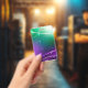 Bright purple and green background with shiny confetti. Festival Mardi Gras.