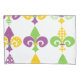 This pillowcase has a Mardi Gras design of fleur de lis lined across the design with different design in them.