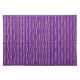 This cloth placemat has a geometric Mardi Gras design of sort of flat-ended ovals repeating across the design in gold and green on a field of purple.