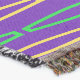 This thro pillow has a geometric Mardi Gras design of sort of flat-ended ovals repeating across the design in gold and green on a field of purple.