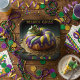 Present your delicious Mardi Gras King Cake with purple, yellow and green frosting and a little crown.