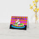 Mardi Gras, King Cake with Mask, paper greeting card with a king cake and theater mask. Cake with icing and purple, green, and golden yellow sugar crystals. A bold diamond pattern in gold and shade of magenta and violet fills in the background. Mardi Gras written in black and script lettering. Art, image, and verse copyright © Shoaff Ballanger Studios.