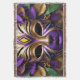 #hec F Image is a digital art featuring a stylized, ornate mask as the central subject. The mask is predominantly purple and gold, with intricate geometric patterns and symmetrical design elements. It has a smooth, glossy finish, giving it a polished appearance. The mask is adorned with vibrant purple and green leaves, adding a natural, organic touch to the otherwise structured design. The background is a rich golden color, complementing the mask's gold accents. The mask's eye holes are deep black, creating a striking contrast with the vivid colors. The overall composition is balanced and visually captivating, with a harmonious blend of colors and textures.