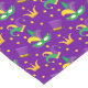 Mardi Gras table runner with colorful feather mask, crown, purple, green, golden clown hat and stars.