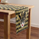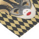 This table runner is shown with a black and gold diamond pattern background print with a festive Mardi Gras festival mask print design.
