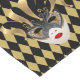 This table runner is shown with a black and gold diamond pattern background print with a festive Mardi Gras festival mask print design.