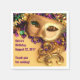 A gold mask set among green and purple beads and gold streamers. A Fluer de lis rests at the bottom. The background is a light gold. Personalize this napkin with your own text. These napkins are an easy way to add a custom element to your cocktails, appetizers or cake at your party. Its elegant design makes it ideal for a birthday, quinceanera, weddings, or company and corporate parties.
