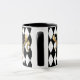 This combo black and white mug has an image of a festive Mardi Gras mask over a black and white diamond pattern print.