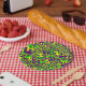 Paper plates with a modern op-art design in the traditional colors of Mardi Gras: purple (justice), green (faith), and gold / yellow (power) to liven up the table at any party.