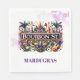 This paper napkin is shown in a festive Mardi Gras celebration print.