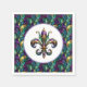 This paper napkin is shown in a festive Mardi Gras Fleur de Lis print.