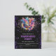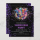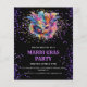 Customizable Mardi Gras party paper invitation. Featuring a colorful Mardi Gras masquerade mask and faux glitter print on a black background.