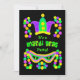A colorful Mardi Gras Party Invitation for you to personalize, with a crown, a mask and plenty of beads in the traditional green, purple and golden yellow colors, on a black background, from a handpainted paper collage by Judy Adamson.