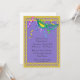 Festive invitation for your Mardi Gras party with colorful mask and streamers on purple background with gold border. Easy to customize with the details of your event.