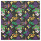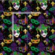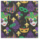Mardi gras patterned fabric with carnival face masks, fleur de lys motifs and jester masks in purple, green and gold on black