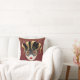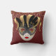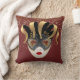 This throw Pillow is shown in burgundy red with a festive Mardi Gras mask print in gold, black and gray colors.