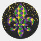 This small size round sticker is shown in a Mardi Gras celebration Fleur De Lis print design.