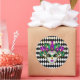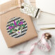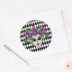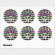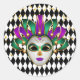 This large size round sticker is shown in a festive Mardi Gras celebration mask print design.