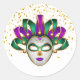 This large size round sticker is shown in a festive Mardi Gras celebration mask print design.