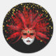 This small size round sticker is shown in a festive Mardi Gras celebration mask print design.