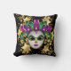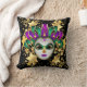 This throw pillow is shown in black with a festive Mardi Gras Mask print design.