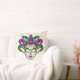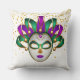 This throw pillow is shown in white with a festive Mardi Gras Mask print design.