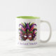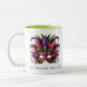 This ceramic coffee mug is shown with Mardi Gras images, Text of "Let the good times roll' is beneath the prints.