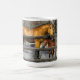This mug features an original artwork of a buckskin mare and her bay foal waiting by a fence in a snowy winter landscape, created in DAZ 3D by artist Jayne Wilson. Horse lovers will appreciate this mug.