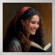 Oil painting portrait of a beautiful smiling Israeli girl reading a book.