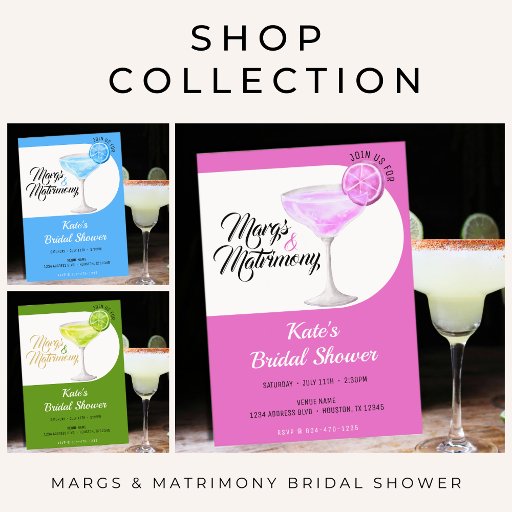 Margs and matrimony white, black and pink margarita bridal shower paper plates. Personalize it with your wedding details.