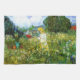 Marguerite Gachet in the Garden by Vincent van Gogh is a vintage fine art post impressionism daily life portrait painting featuring a woman, Marguerite Gachet wearing a hat (she was the daughter of Dr. Paul Gachet who treated van Gogh in Auvers). The girl is standing in her flower garden next to some potted plants and cypress trees in the distance.