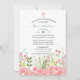 Soft pink and green wild flowers accent the bottom of the invitation. Embellished with a pink and white cross.