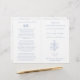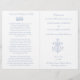 The front cover features a beautiful blue (Hex Code #a6b8d3) Marian Cross, honoring the Blessed Mother Mary. On the back, just above the prayer for the bride and groom, are the three hearts of Jesus, Mary, and St. Joseph.