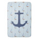 In typical nautical fashion this beautiful bath mat is decorated with sailing ships and anchors nestled against a background of white and blue stripes -- and waiting to take its place in your bathroom.
