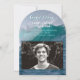 Graduation announcement for a marine biology or science major. Crashing ocean waves background with place for his, or her, photo. Text at the top is “congratulations” with name and school information. The photo is outlined with dark blue lines. Upload a horizontal / landscape orientation photo. Blue green sea colors with white printed text.