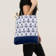This tote bag is shown with a cute maritime anchor print design in Navy & White.