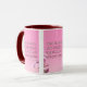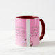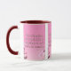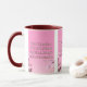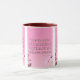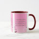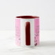 This two-tone mug showcases a design that features a Hammersmith One print font with white letters dark pink outline featuring the "Mark 10:9" KJV bible scripture verse over a picture displaying a pink back with pink and white flowers placed on top in this faith based theme. This verse is referencing the Book Of Mark 10th chapter showing the 9th verse in this bible scripture quote theme from the King James bible. The rim & handle are glazed in matching colors available in 11-ounce or 15-ounce sizes microwave and dishwasher safe ceramic construction.