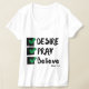 This women's v-neck t-shirt design is based on the Mark 11:24 bible scripture displaying the word "Desire, Pray, Believe" a paint brush stlye print font with black letters and green and black checklist plus bible citation in this KJV faith based quote theme. This tee is contoured and side-seamed for a feminine made with lightweight fabric for comfort.