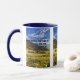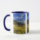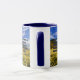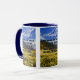 This two-tone mug features an architype aubette print font with black letters blue outline showcasing the "Mark 1:15" KJV bible scripture verse over a picture displaying a hill-top with bright green grass under a cloudy blue sky collection of cartoon like colored flowers with different shades of pink with a hill-top view in this nature theme. This verse is referencing the Book Of Mark 1st chapter showing the 15th verse in this bible scripture quote theme from the King James bible. The rim & handle are glazed in matching colors available in 11-ounce or 15-ounce sizes microwave and dishwasher safe ceramic construction.