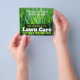 LAWN CARE customizable promotional double sided 4x5 flyer to market your lawn care service. Professionally designed, eye-catching and proven effective in getting customers. Features high resolution, closeup photograph of healthy green grass. Edit the text to suit. Makes a thoughtful and practical gift. Quantity discounts apply. Hang in every local supermarket, library, pizzeria, deli etc - anywhere that there a bulletin board. Hand out door to door. Keep a stack with you wherever you go!