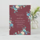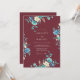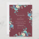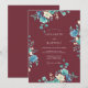 A deep maroon backdrop provides a bold foundation for this design, highlighting a collection of teal and cream roses. Artistic watercolor foliage and smaller blue blossoms border the layout to create a rich, moody aesthetic. This botanical arrangement is ideal for couples seeking a sophisticated and high-contrast look for their special day.