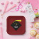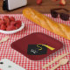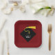 Creative graduation party or event plates for class of '26 grads featuring funny line and classic black graduation cap with gold tassel on maroon background.