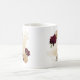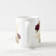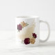 Beautiful coffee mug featuring maroon and beige gold flowers with green leaves .