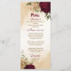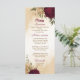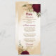 Beautiful fall wedding menu card featuring maroon and beige gold flowers with green leaves .