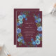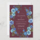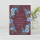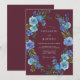 This design features a deep maroon background accented by a vibrant arrangement of blue roses and verdant foliage. The moody color palette creates a sophisticated atmosphere perfect for a late-season nuptial event. Painterly watercolor details bring a sense of artistry and elegance to the floral display.