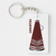Custom maroon and white cheerleader's key chain, with graphics of a red, white, and silver tone megaphone, with graphic text reading CHEER on it. Custom maroon text running vertical up the left side of the key chain is ready to personalize with your name, mascot, or school initials. Great little gift idea to any cheerleader.