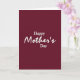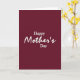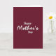 This card features a deep maroon background that feels cozy and romantic, like a quiet evening wrapped in warmth ❤️. Centered on the front is a three-line message in bright white lettering that stands out clearly against the dark backdrop. The word “Happy” sits at the top in a classic serif style, spaced neatly so it feels calm and steady. “Mother’s” stretches across the middle in a flowing cursive look with gentle curves, like a tender note written with care. “Day” appears beneath it in the same serif style as “Happy,” creating a balanced, affectionate rhythm from top to bottom. The layout is symmetrical and uncluttered, with generous empty space around the words that makes the message feel intimate and focused 🌼. Soft, even lighting keeps the maroon tone smooth and rich, while the white text remains crisp and centered. The only elements on the front are the maroon field and the white “Happy Mother’s Day” text stacked in the middle.