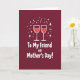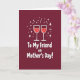 Designed with a deep maroon background, the card sets a cozy, intimate scene that feels like a quiet toast between close friends ❤️. Two simple stemmed glasses sit at the center in thin white outlines, angled toward each other as if meeting gently in midair. Inside each bowl, a glowing red drink is dotted with tiny white bubbles, suggesting a fizzy celebration shared with someone dear. Around the glasses, small white stars and short radiating lines scatter outward, like a soft burst of excitement after the clink. The closeness of the glass rims and the upward sparkle details add a tender, affectionate energy without needing any characters. Below the illustration, the message “To My Friend on Mother’s Day!” appears centered in rounded white lettering, standing out clearly against the dark background 🌼. The stars and thin lines are brightest near the top and sides of the glasses, with a few smaller marks drifting outward into the maroon space.